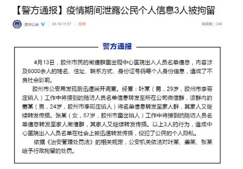 據山東膠州公安發(fā)布消息稱(chēng) ,4月13日,一份青島膠州中心醫院感染病例密切接觸人員信息名單在網(wǎng)絡(luò )傳播,內容涉及6000余人的姓名、住址、聯(lián)系方式、身份證號碼等個(gè)人身份信息!經(jīng)調查發(fā)現,系葉某將工作中接觸到的人員名單信息隨意泄露出去,隨后姜某、張某又繼續轉發(fā)傳播,造成惡劣影響。公安機關(guān)依法對3人給予行政拘留處罰。而此前不久,2月6日,云南也發(fā)生一起文山州人民醫院5名醫務(wù)人員因偷拍、散布疫情防控信息,被文山市公安局依法作出行政處罰的案件。
