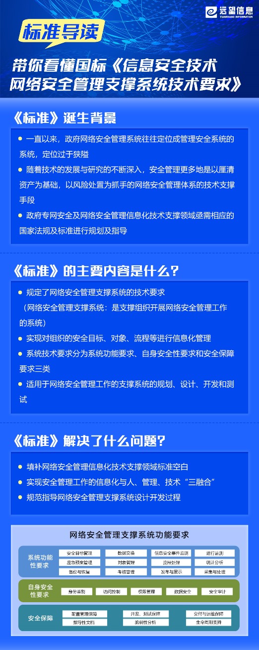 3月6日,由遠望信息牽頭制定的國標的《信息安全技術(shù) ?網(wǎng)絡(luò )安全管理支撐系統技術(shù)要求》正式獲批發(fā)布(詳見(jiàn):鏈接),作為網(wǎng)絡(luò )安全管理信息化與政務(wù)專(zhuān)網(wǎng)安全建設領(lǐng)域的首個(gè)國家標準,它的主要內容是什么,又解決了什么問(wèn)題?今天,我們就來(lái)帶大家一圖看懂——