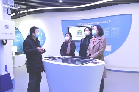 夏海燕處長(cháng)(右一)一行在遠望信息展廳了解企業(yè)業(yè)務(wù)及產(chǎn)品情況