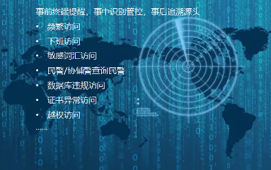 1)以終端行為監測與管控為核心,獲取訪(fǎng)問(wèn)者身份信息、訪(fǎng)問(wèn)詳細數據,為事后查處不正當應用訪(fǎng)問(wèn)行為提供全面、準確的數據支撐。?