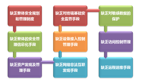 3、網(wǎng)絡(luò )非法互聯(lián)風(fēng)險:多網(wǎng)卡、網(wǎng)絡(luò )出口、網(wǎng)絡(luò )代理、無(wú)線(xiàn)AP、NAT邊界等多形式繞過(guò)安全設施監管,與外部網(wǎng)絡(luò )聯(lián)通情況屢見(jiàn)不鮮。