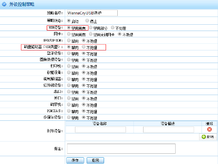 ? ? ? 從管理界面打開(kāi)“外設控制”策略,并按如下配置后分配到所有設備,減少通過(guò)USB移動(dòng)存儲設備的感染風(fēng)險。