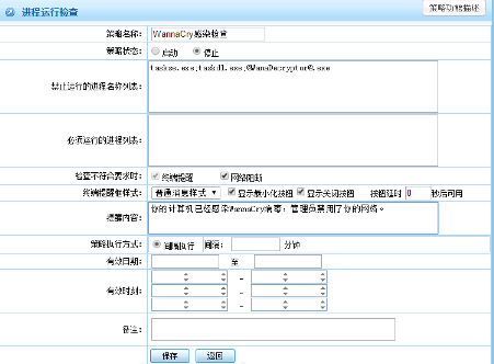 ? ? ??從管理界面打開(kāi)“進(jìn)程運行檢查”策略,并按如下配置后分配到所有設備。