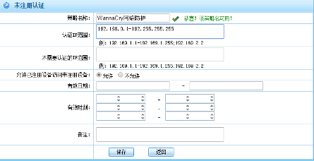 ? ? ?如果大量設備被感染,建議從管理界面打開(kāi)“未注冊認證”策略,并按如下配置后分配到所有設備,確保未被感染設備的安全。