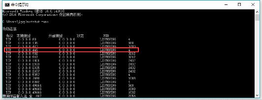 ? ? ?開(kāi)始---->運行---->cmd,或者是window+R組合鍵,調出命令窗口,輸入命令:netstat -ano,列出所有端口的情況。在列表中我們觀(guān)察開(kāi)放的445端口。