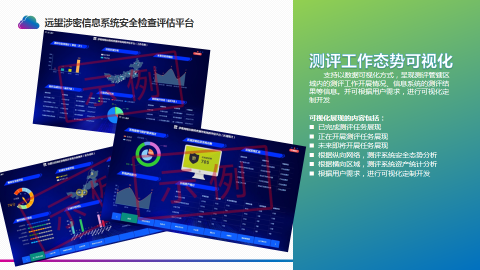 系統支持以數據可視化方式,從工作態(tài)勢、安全態(tài)勢、資產(chǎn)分析等多個(gè)方面呈現測評管轄區域內的測評工作開(kāi)展情況、涉密信息系統的測評結果。此外,系統還可根據用戶(hù)需求,進(jìn)行可視化定制開(kāi)發(fā),真正實(shí)現分級保護測評工作的全局把控。