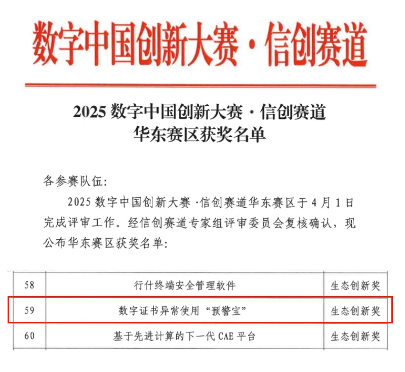近日,2025數字中國創(chuàng )新大賽·信創(chuàng )賽道獲獎名單正式出爐,遠望信息與杭州市公安局蕭山區分局、杭州蕭山云嘯研究院科技有限公司合作打造的“數字證書(shū)異常使用‘預警寶’”項目從數百個(gè)參賽項目中脫穎而出,榮獲華東賽區生態(tài)創(chuàng )新獎。