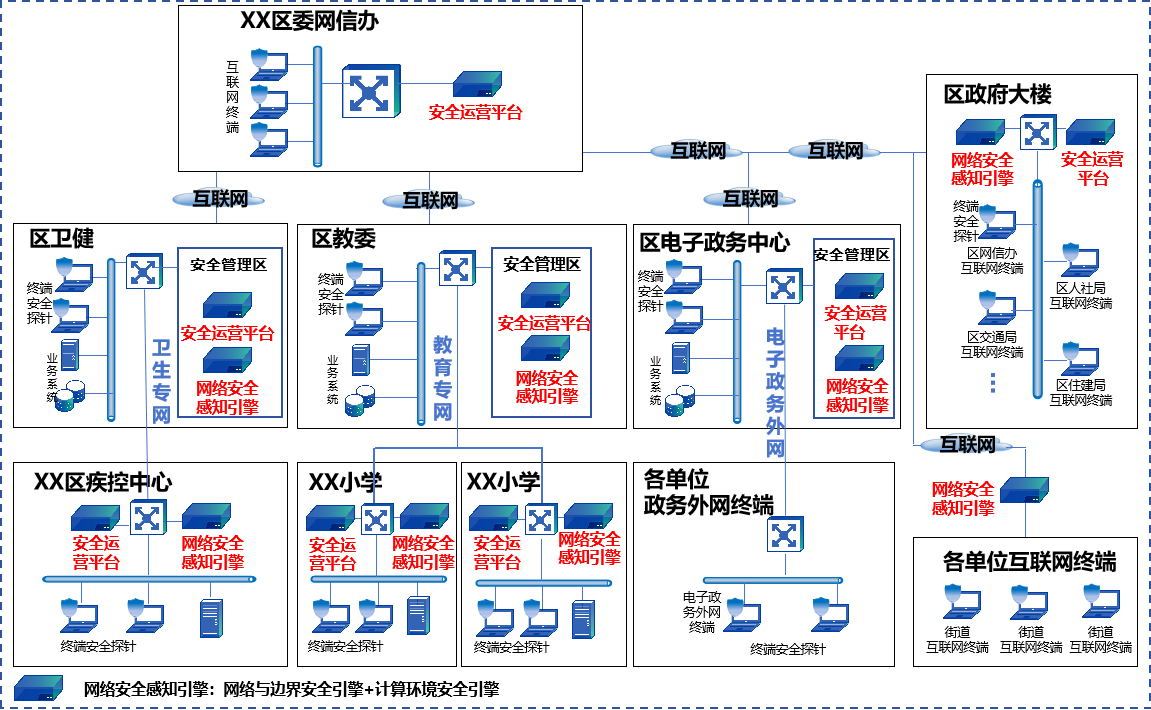 部署區一級平臺1套(區委網(wǎng)信辦)、二級平臺4套(區衛健委、區教委、區電子政務(wù)中心、區政府互聯(lián)網(wǎng))、三級平臺3套(區疾控中心、蜀都學(xué)校、華新小學(xué)),安全探針16臺,終端安全客戶(hù)端軟件1014套。實(shí)現了軟硬件資產(chǎn)、風(fēng)險隱患等信息三級平臺間的級聯(lián)推送,區委網(wǎng)信辦平臺的統一展示。展現了網(wǎng)信統籌監管、各行業(yè)主管單位各負其責的系統架構。